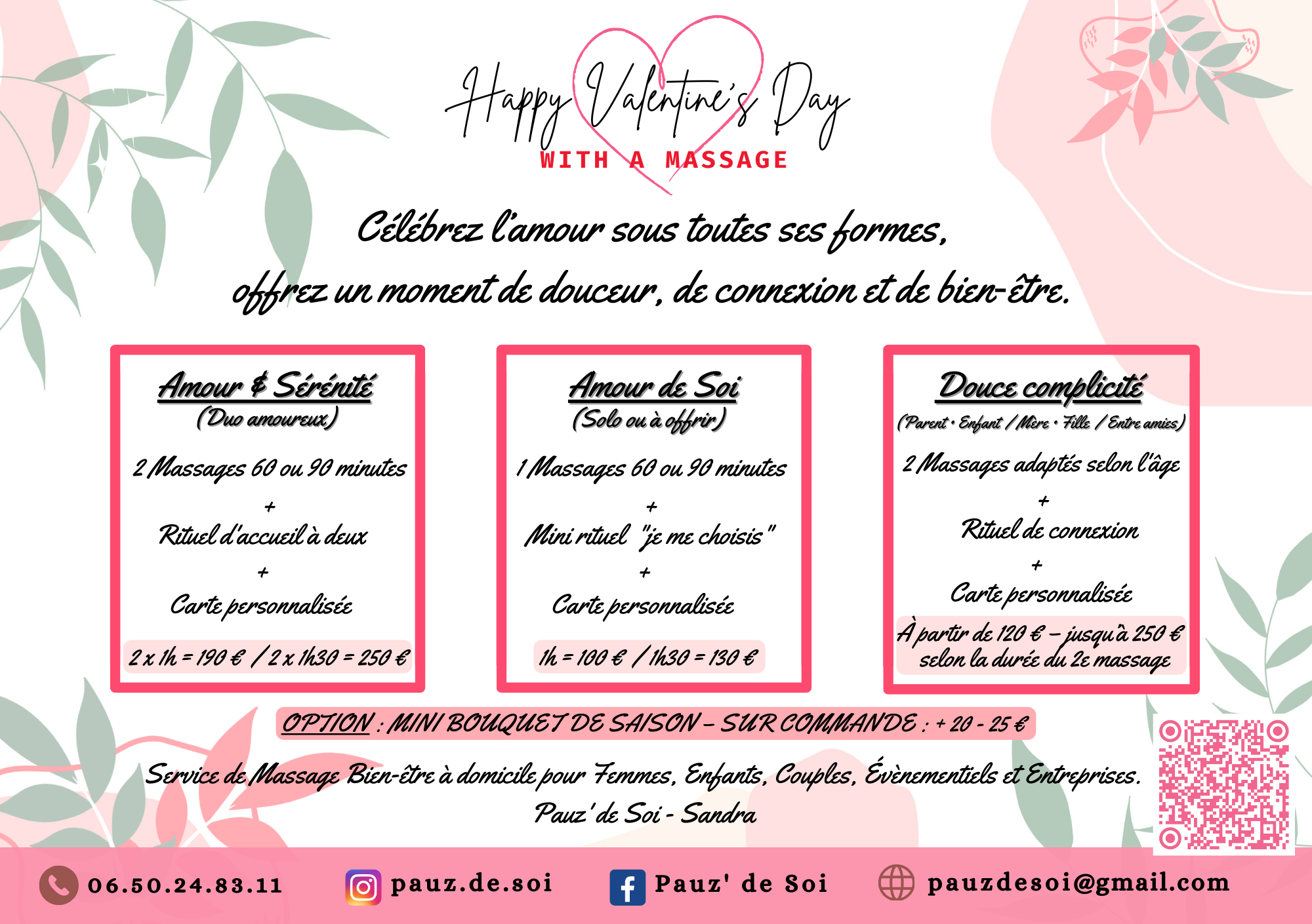 Parce que chaque personne mĂ©rite une attention unique, je conçois mes prestations comme de vĂ©ritables expĂ©riences personnalisĂ©es, adaptĂ©es aux besoins et aux envies de chacun. Mon approche allie chaleur humaine, Ă©coute et professionnalisme, pour offrir bien plus qu’un massage : un moment de dĂ©tente authentique et mĂ©morable. Avec Pauz’ de Soi, vous choisissez un cadeau qui reflĂšte la qualitĂ©, la douceur et l’élĂ©gance.